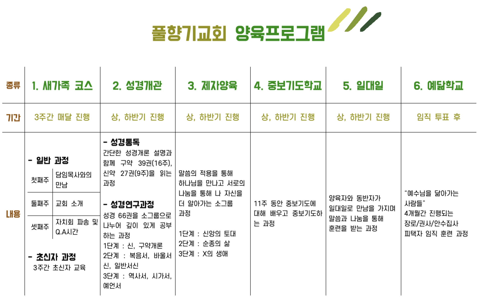 - 양육자와 동반자가 일대일로 만남을 가지며, 말씀과 나눔을 통해 훈련을 받는 과정